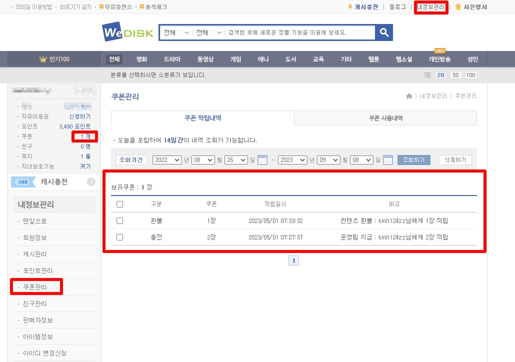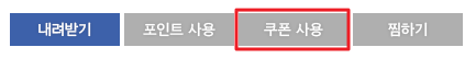 1. 현재 보유중인 쿠폰은 로그인 위치의 '쿠폰'이나 '내정보관리 > 쿠폰관리'에서