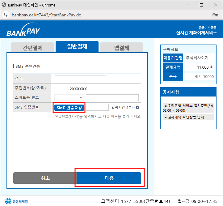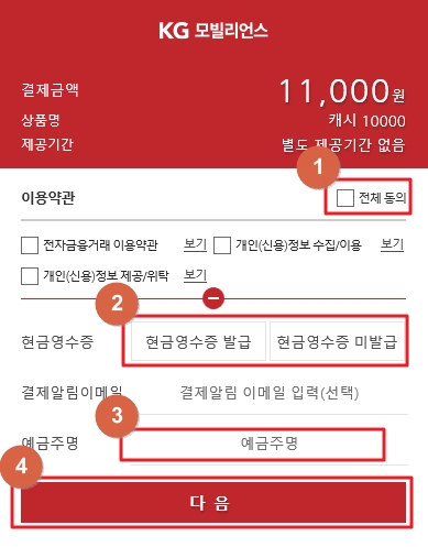 2. 결제창이 나타나면 '전체동의'에 체크하신 후 [현금영수증 발급여부, 예금주명] 정보를 입력 후 [다음]을 누릅니다.