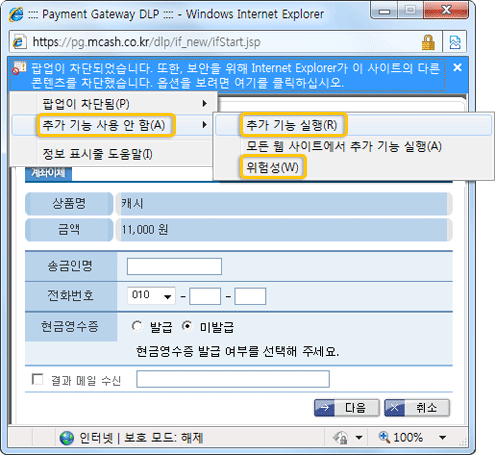 - 팝업 차단 또는 추가기능 설치문제
