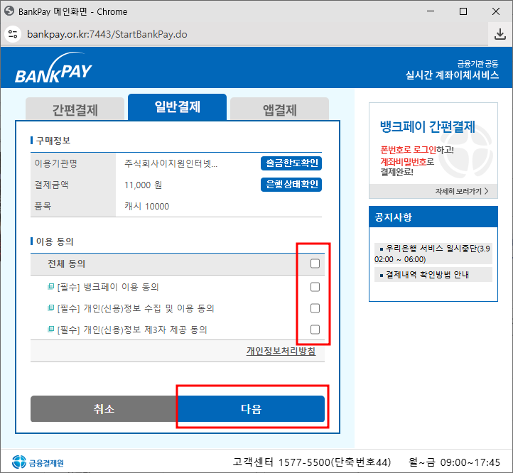 4. 일반결제 진행시 이용동의 약관 '전체동의'에 체크 후 [다음]버튼을 누릅니다.