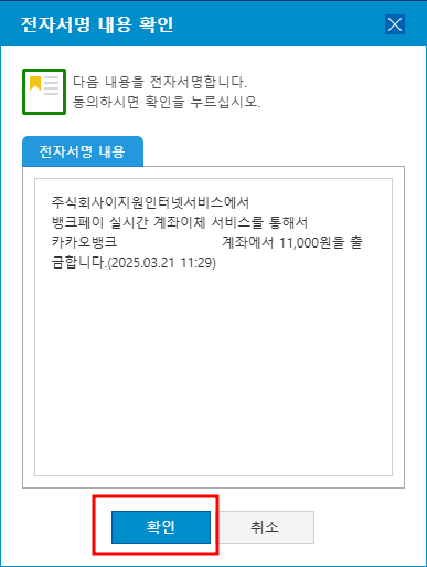 6. 전자서명 내용을 꼼꼼히 확인 후 [확인]을 누릅니다.