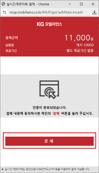 9. 아래의 그림과 같이 내용이 나타나면 [결제]을 누릅니다.