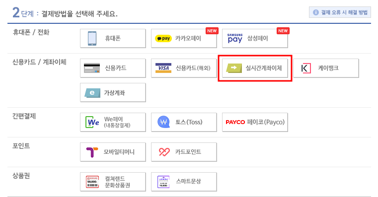 실시간 계좌이체는 아래의 방법을 참고해 주시기 바랍니다.