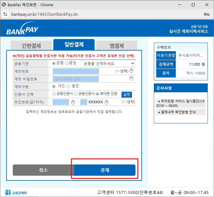 5. [은행, 계좌번호, 계좌 비밀번호, 인증서 선택, 주민등록번호 앞 7자리]를 입력하고 [결제]를 누릅니다.